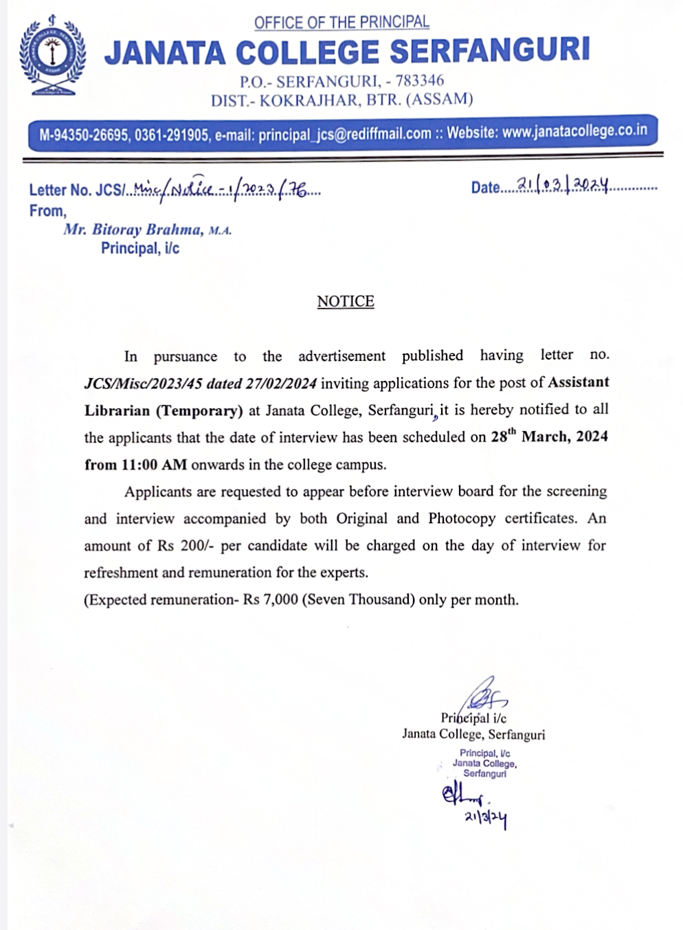 Regarding Interview date for the post of Assistant Librarian (temporary) View 2024-03-21