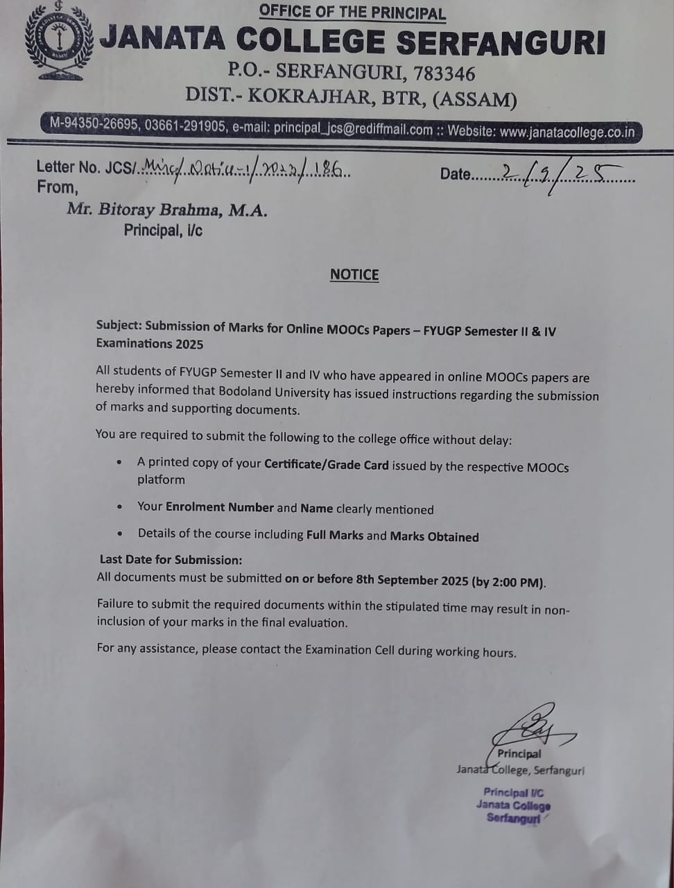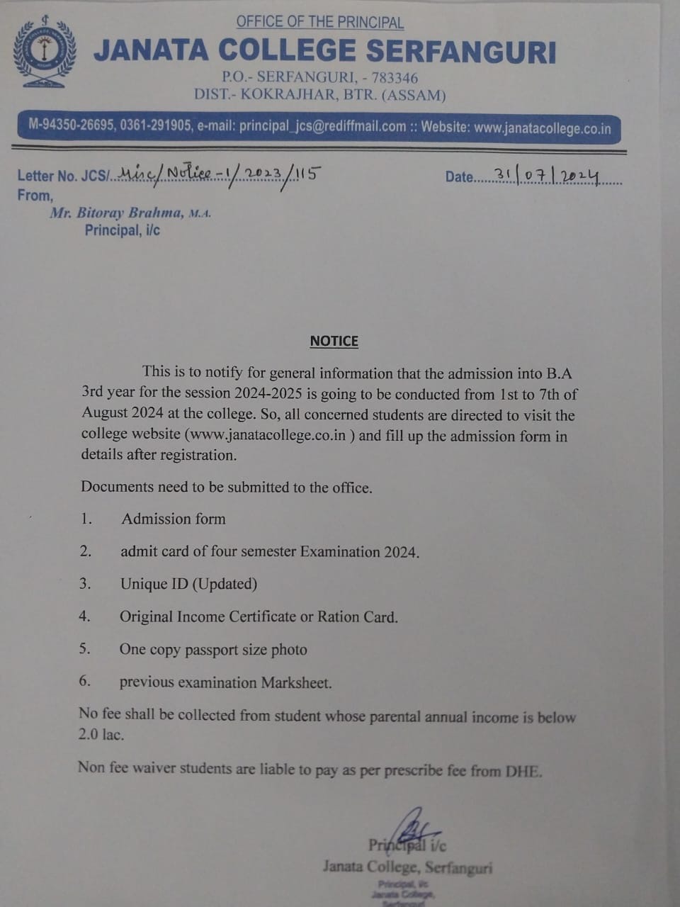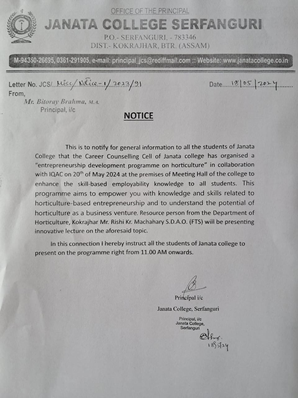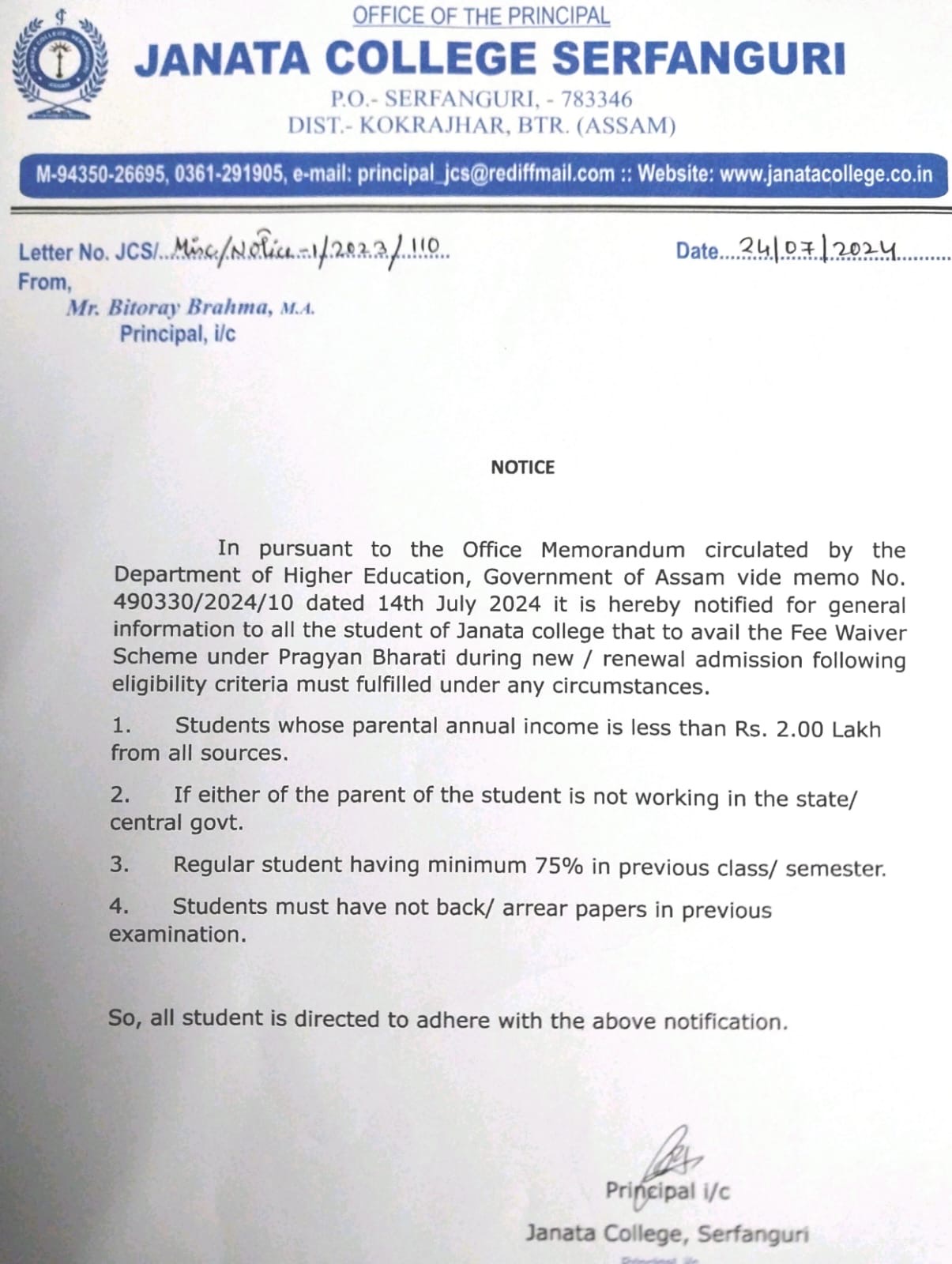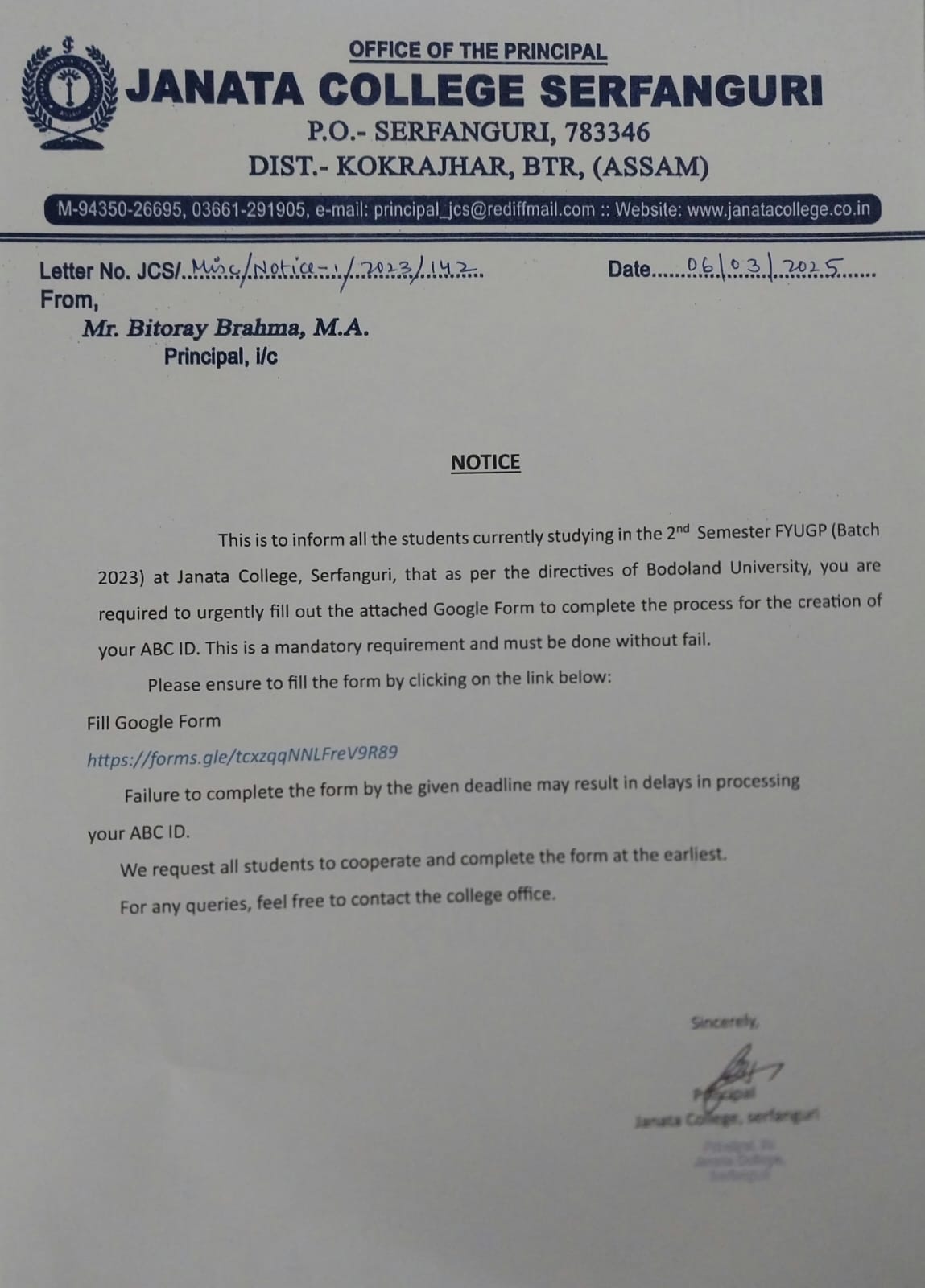 NOTICE TO ALL STUDENTS OF JANATA COLLEGE, SERFANGURI FOR STRICK COMPLIANCE OF ORDER. View 2025-03-29