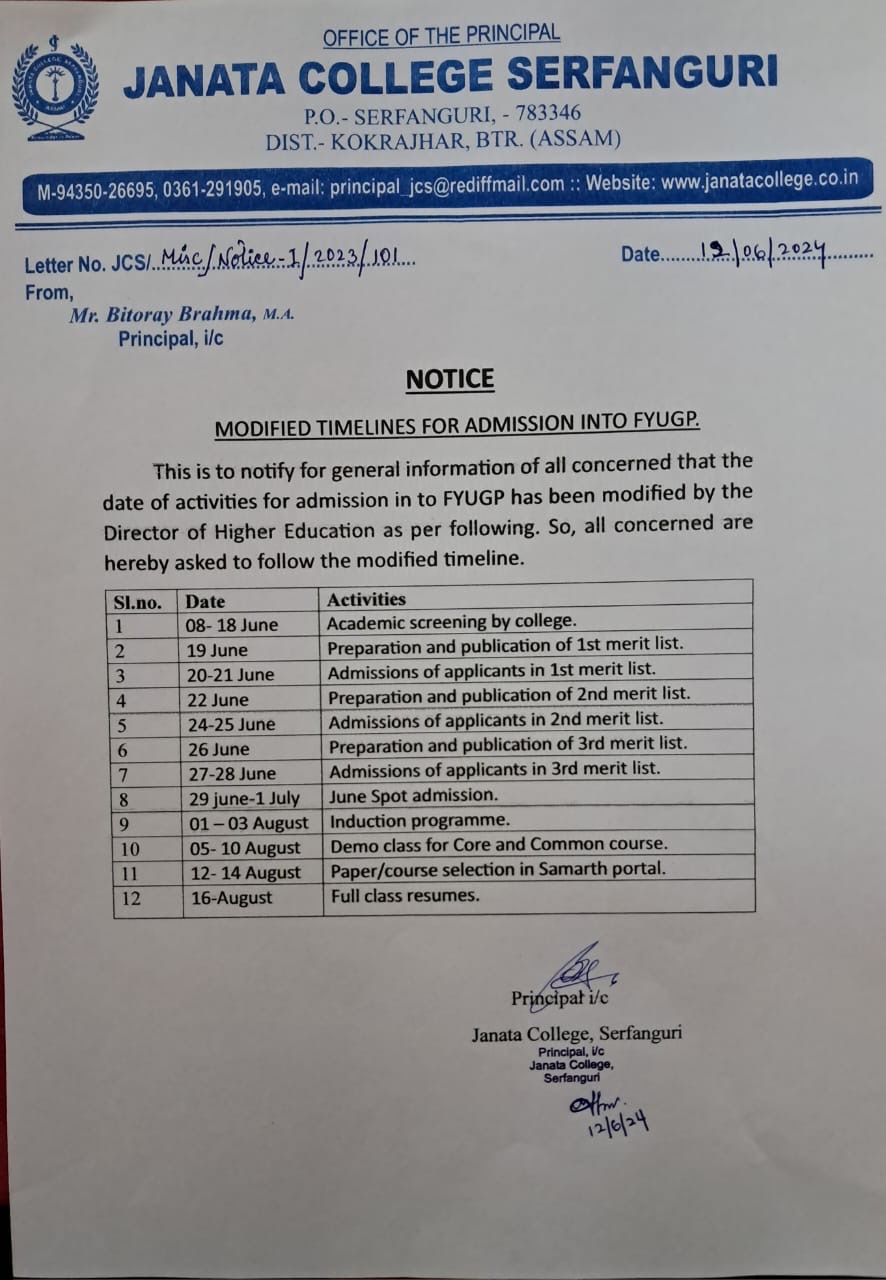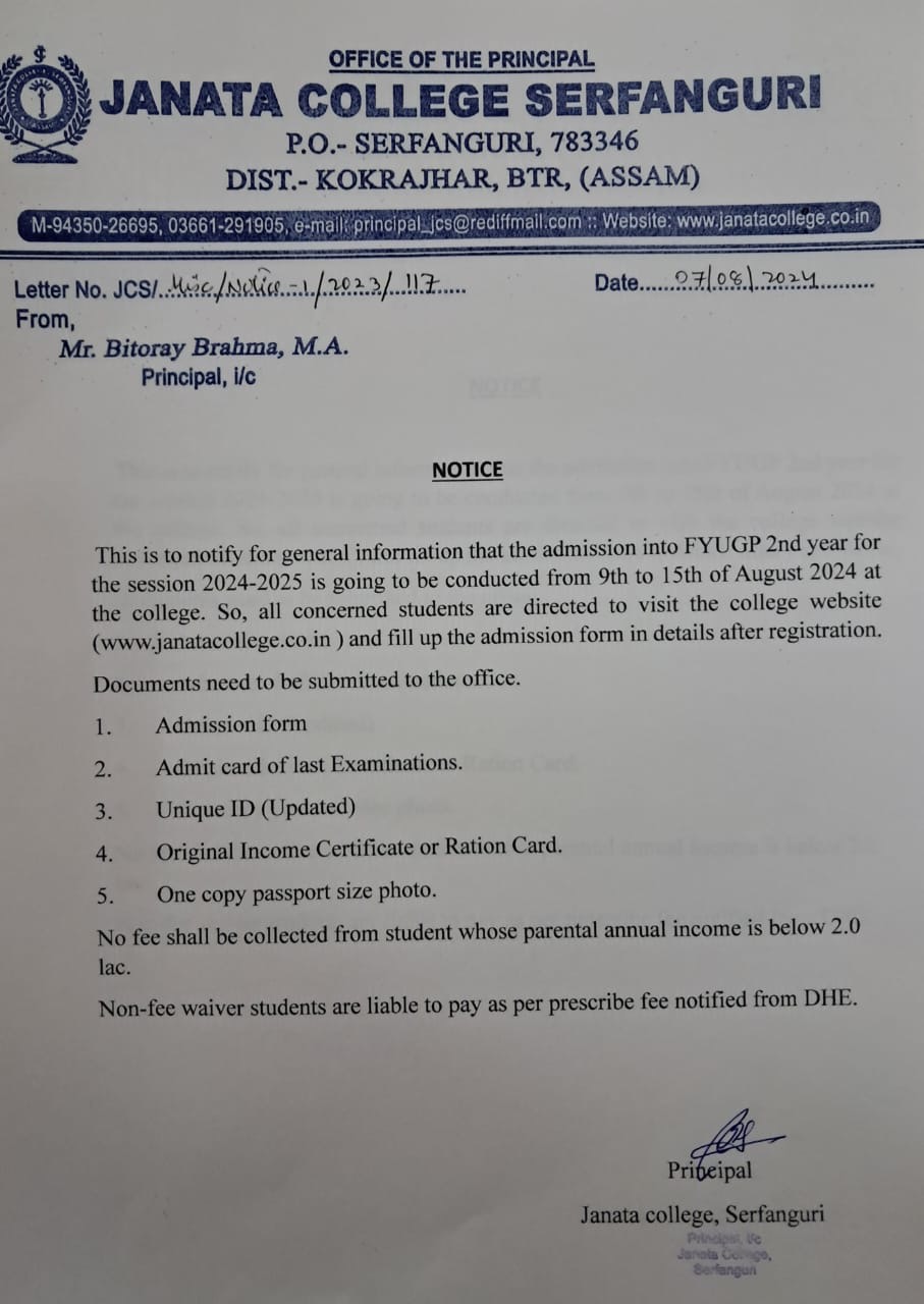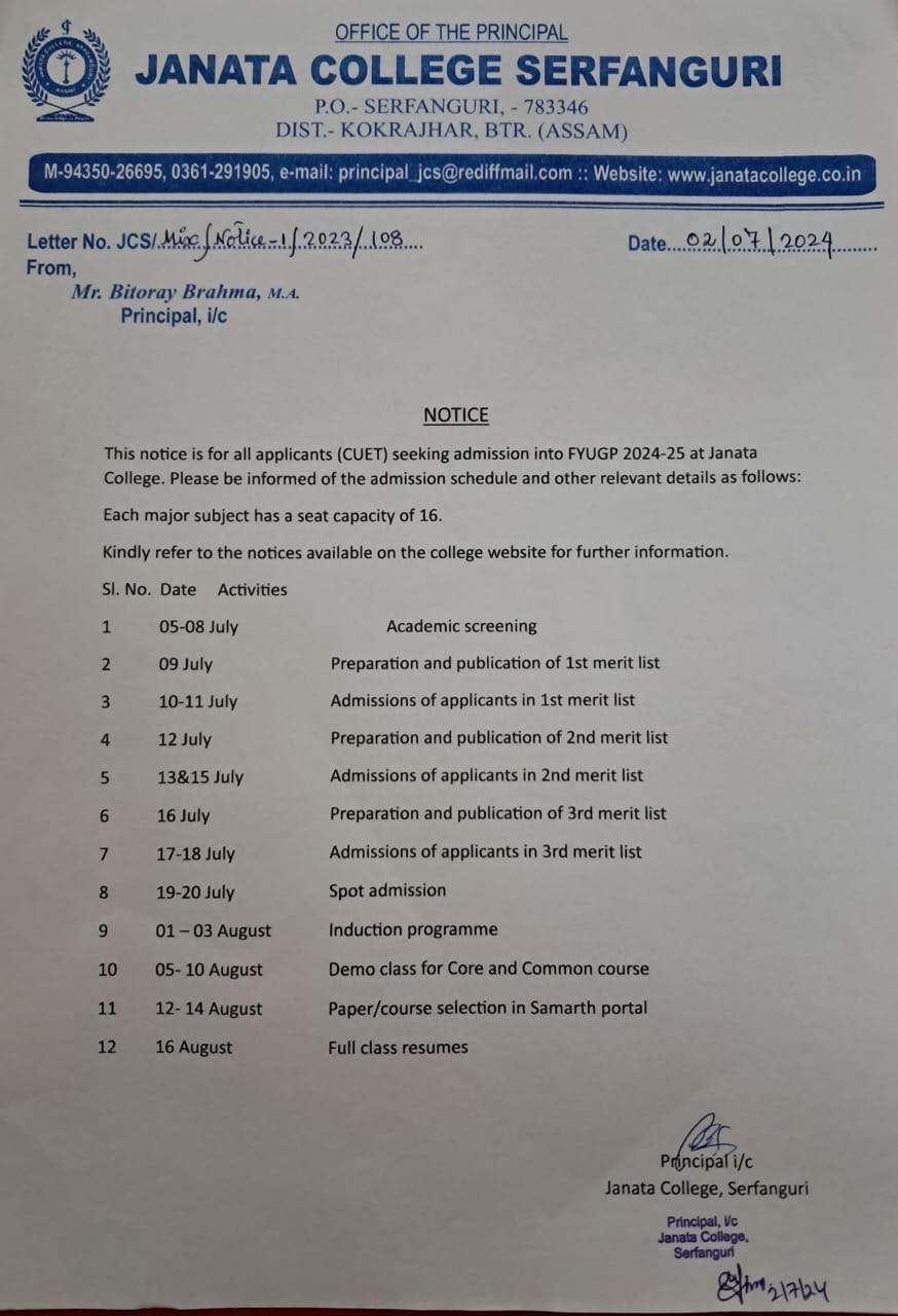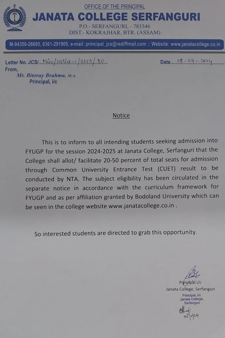 Notice regarding Admission into FYUGP for the session 2024-2025 at Janata College, Serfanguri through CUET (Common University Entrance Test) View 2024-04-10
