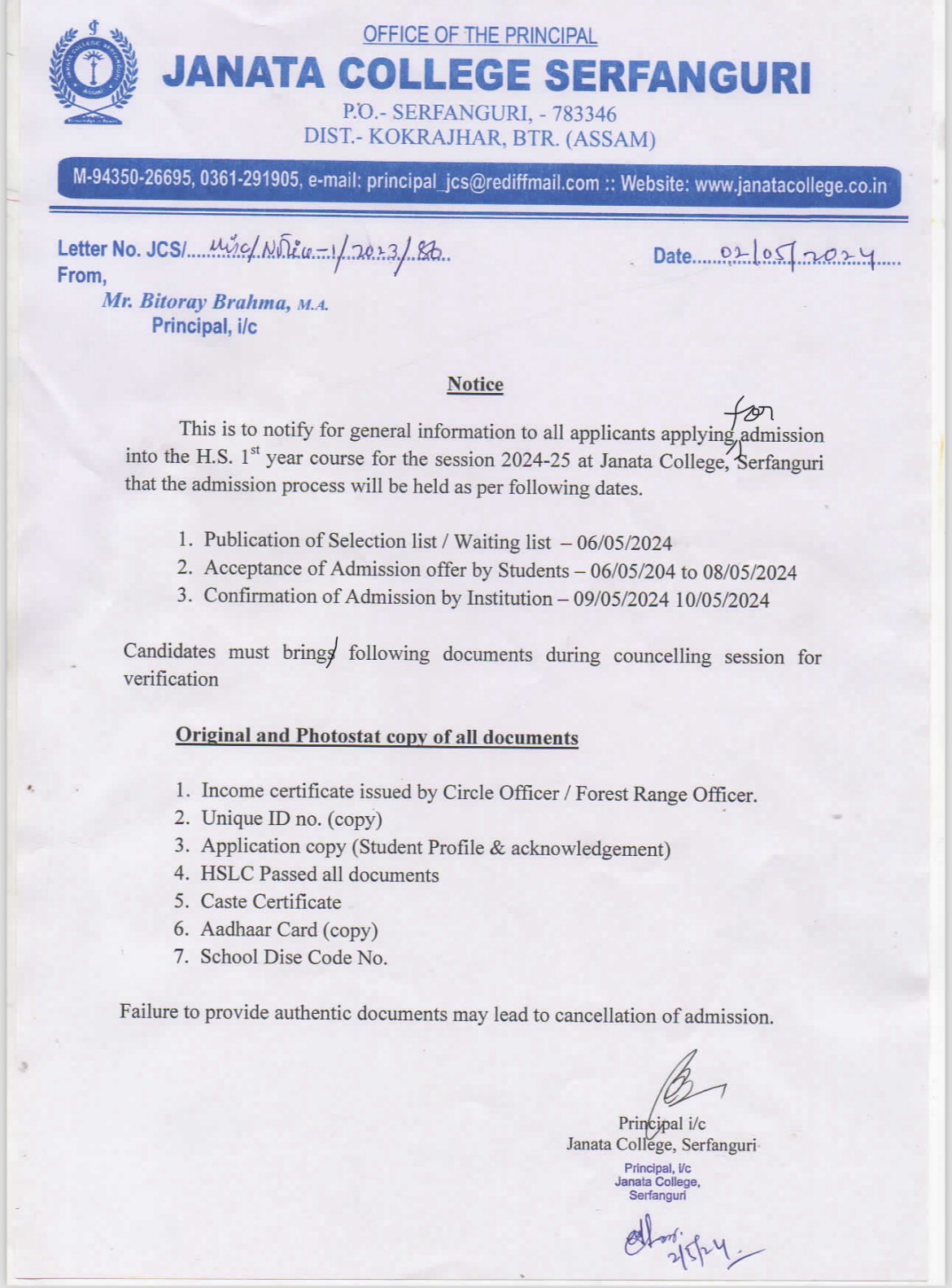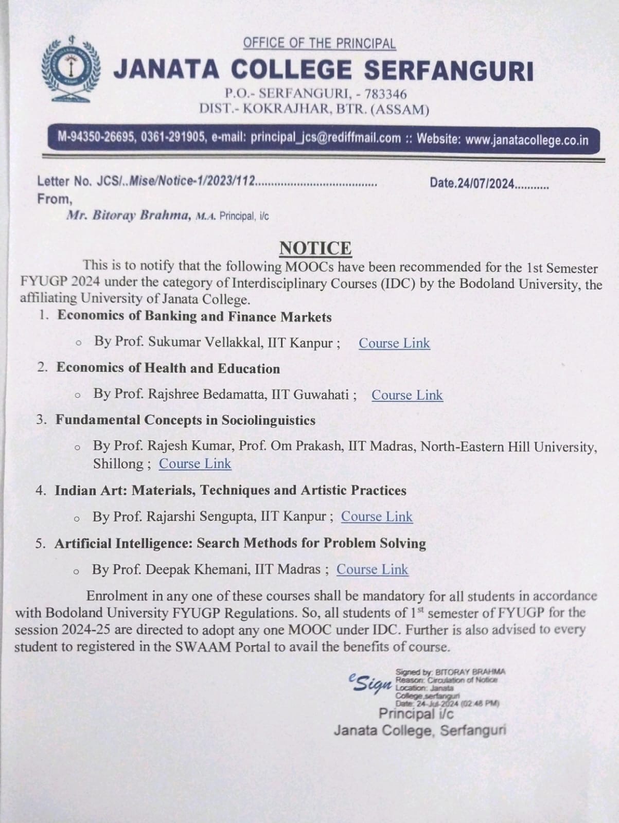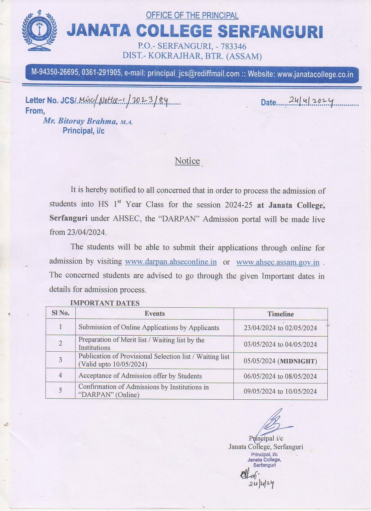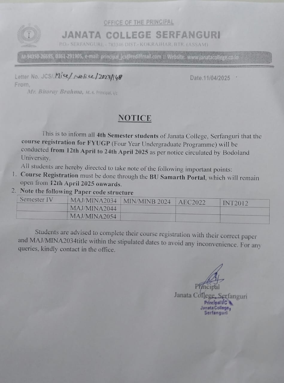 Notice regarding Admission into FYUGP for the session 2024-2025 at Janata College, Serfanguri through CUET (Common University Entrance Test) View 2024-04-10