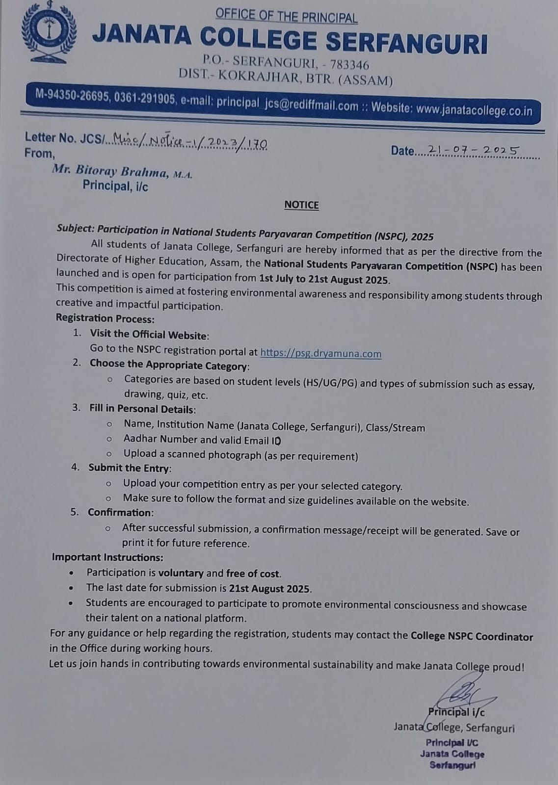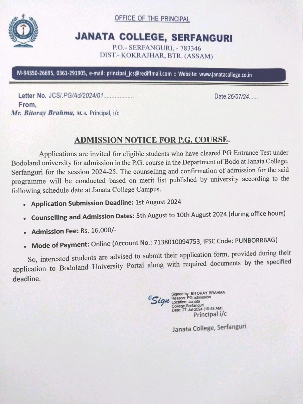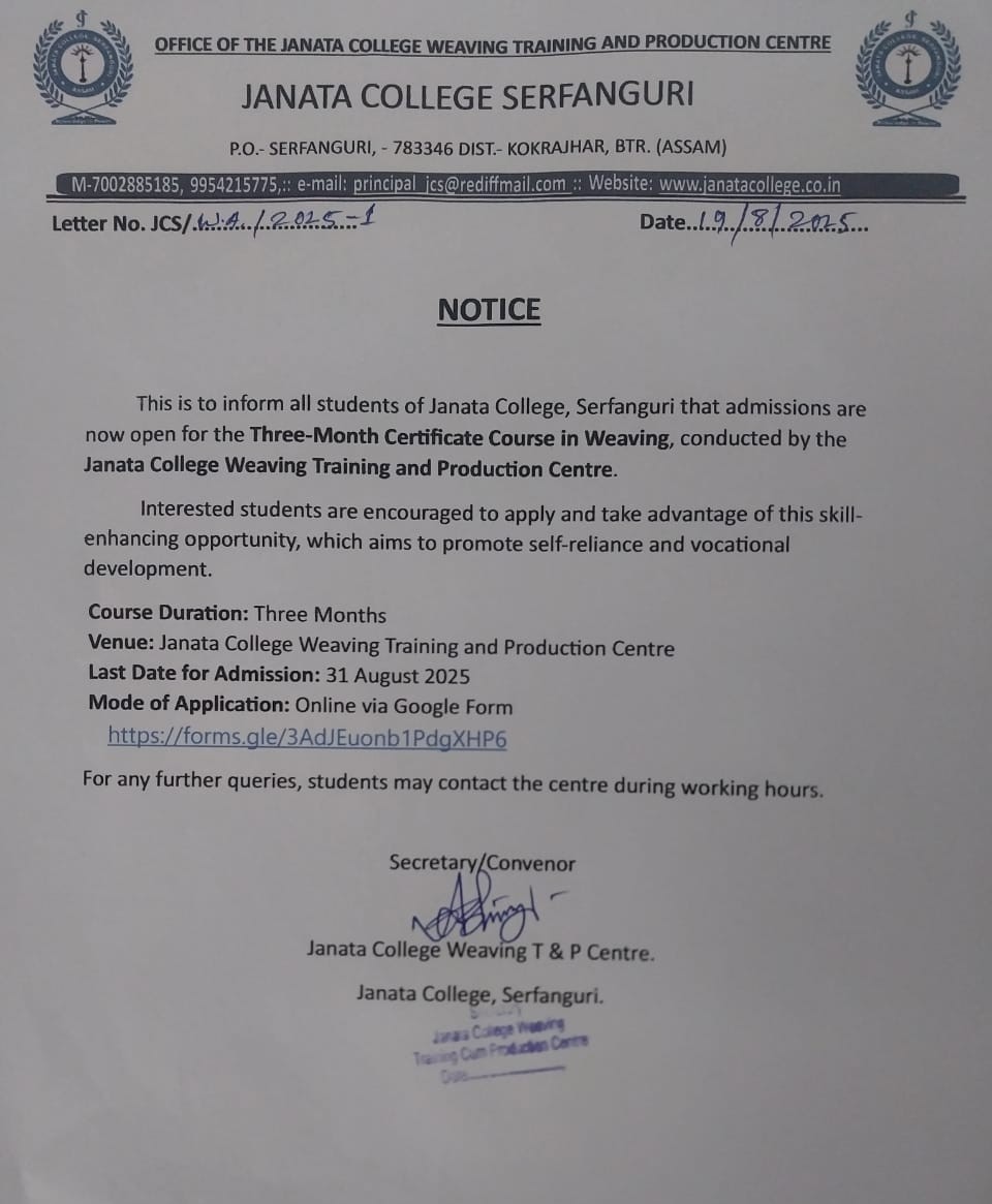 Notice inviting application for admission into Janata College NSS Unit. View 2025-08-27