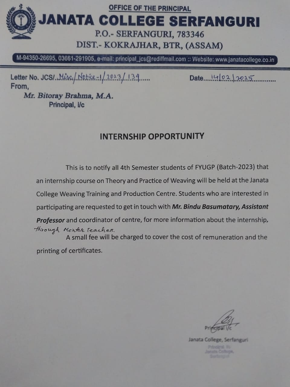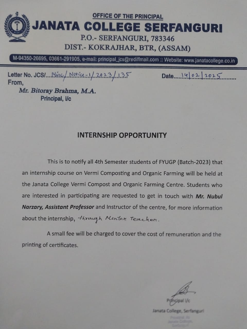 Notice to the Alumni of Janata College, Serfanguri regarding Apprenticeship-cum-Job opportunity. View 2025-02-21