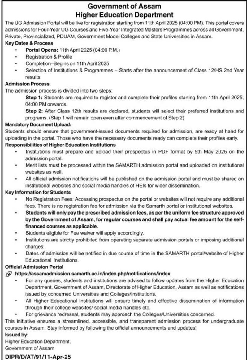 Four Year Undergraduate Courses and Five Year Integrated Masters Programmes Notification Served by thr Department of Higher Education, Assam. View 2025-04-12