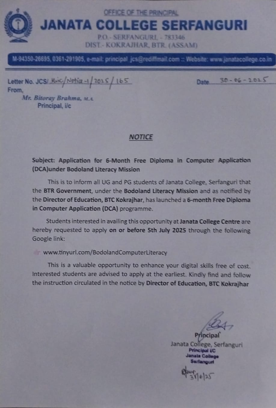 Notice inviting application for free Diploma in Computer Application program at Janata College,