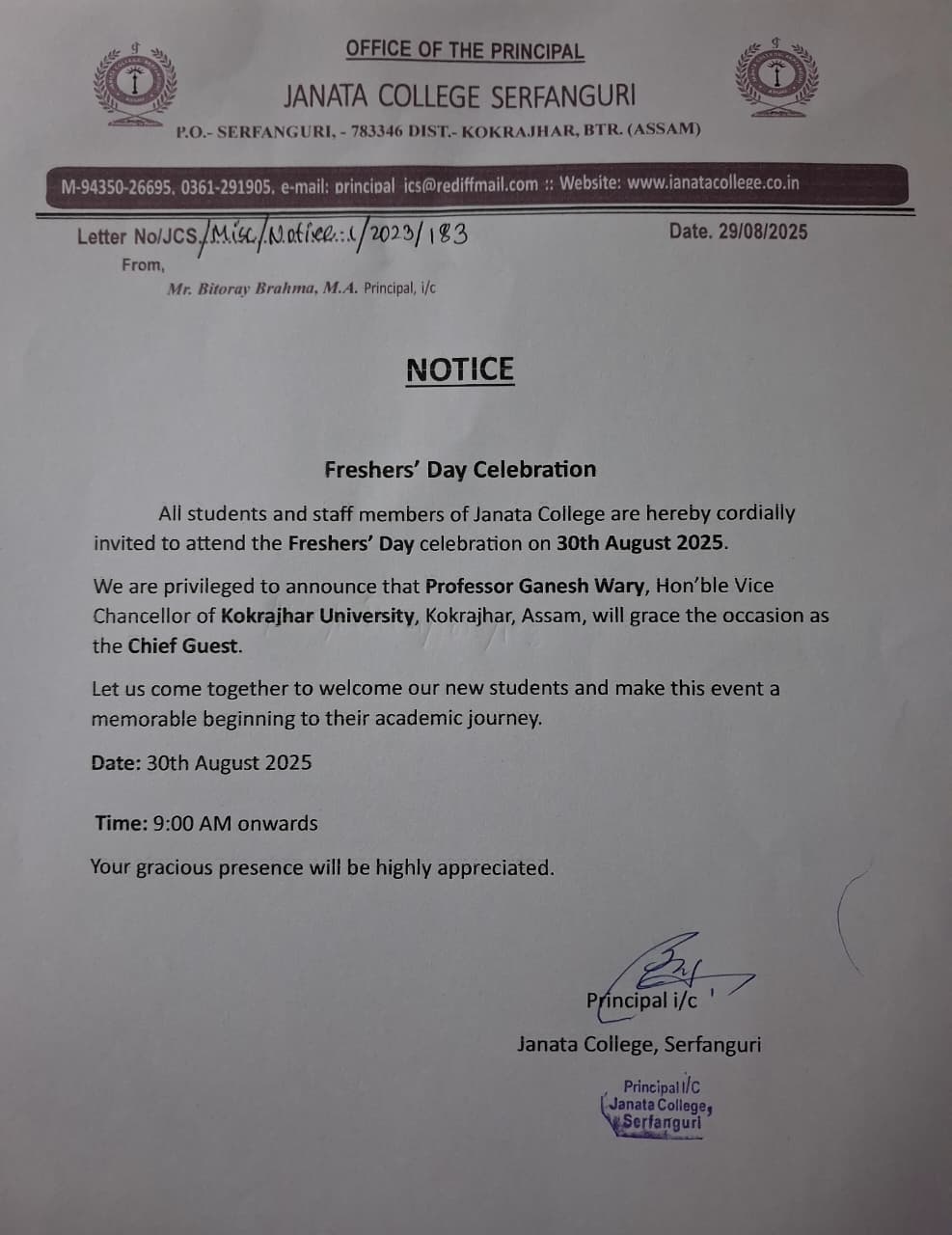 Notice regarding Freshers Day Celebration-2025. View 2025-08-28